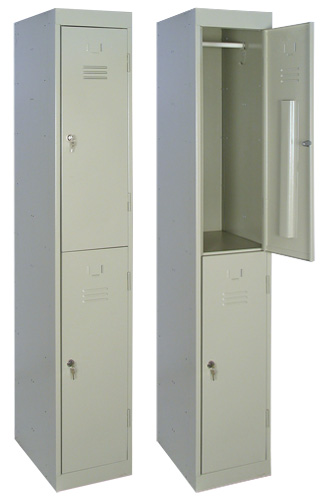 Шкаф металлический разборной односекционный, с 2-мя отделениями. Предназначен для хранения сменной одежды в раздевальных комнатах спортивных залов, бассейнов, школ и т.д. Каждое отделение шкафа оснащено индивидуальным врезным замком и перекладиной для вешалки. Покрытие - полимерное порошковое серого цвета (RAL 7035).