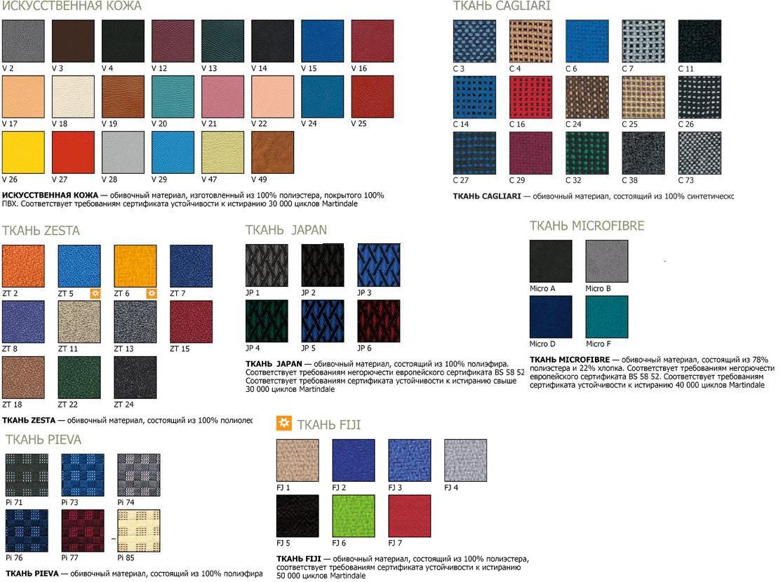 Кресло может быть выполнено в искусственной коже, тканях Cagliari, Pieva, Zesta, Microfibre. Модель оснащена механизмом «Перманент-контакт», нерегулируемыми подлокотниками и металлической базой с пластиковыми накладками.