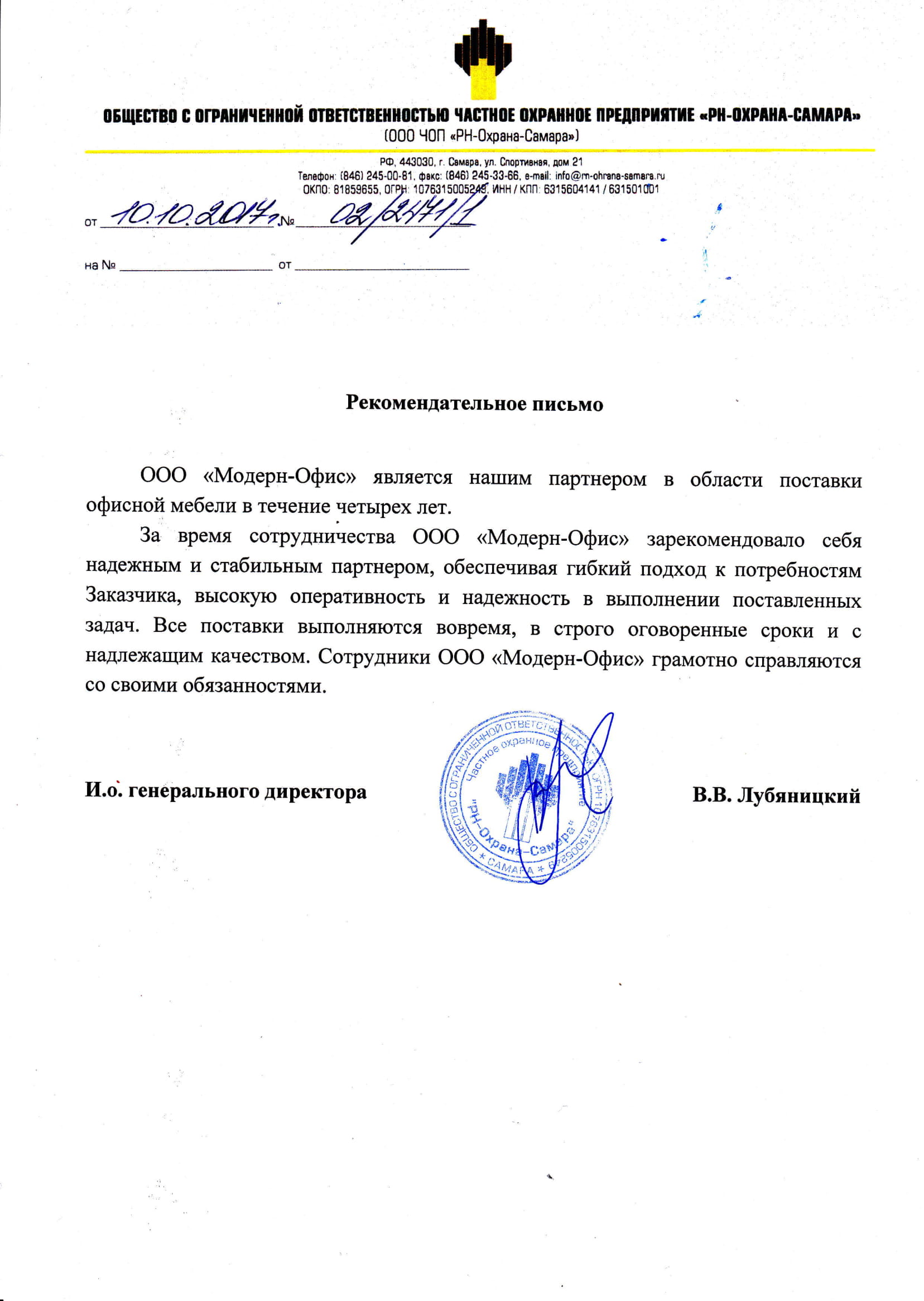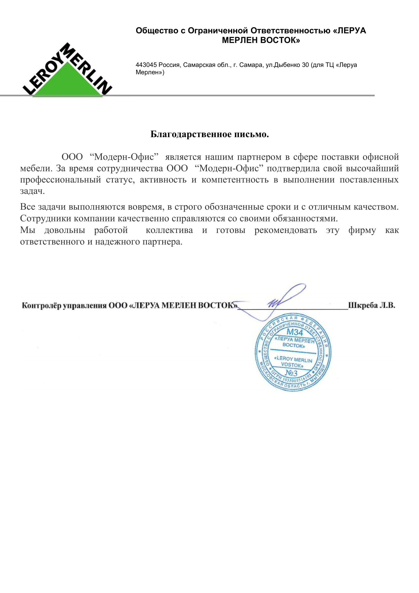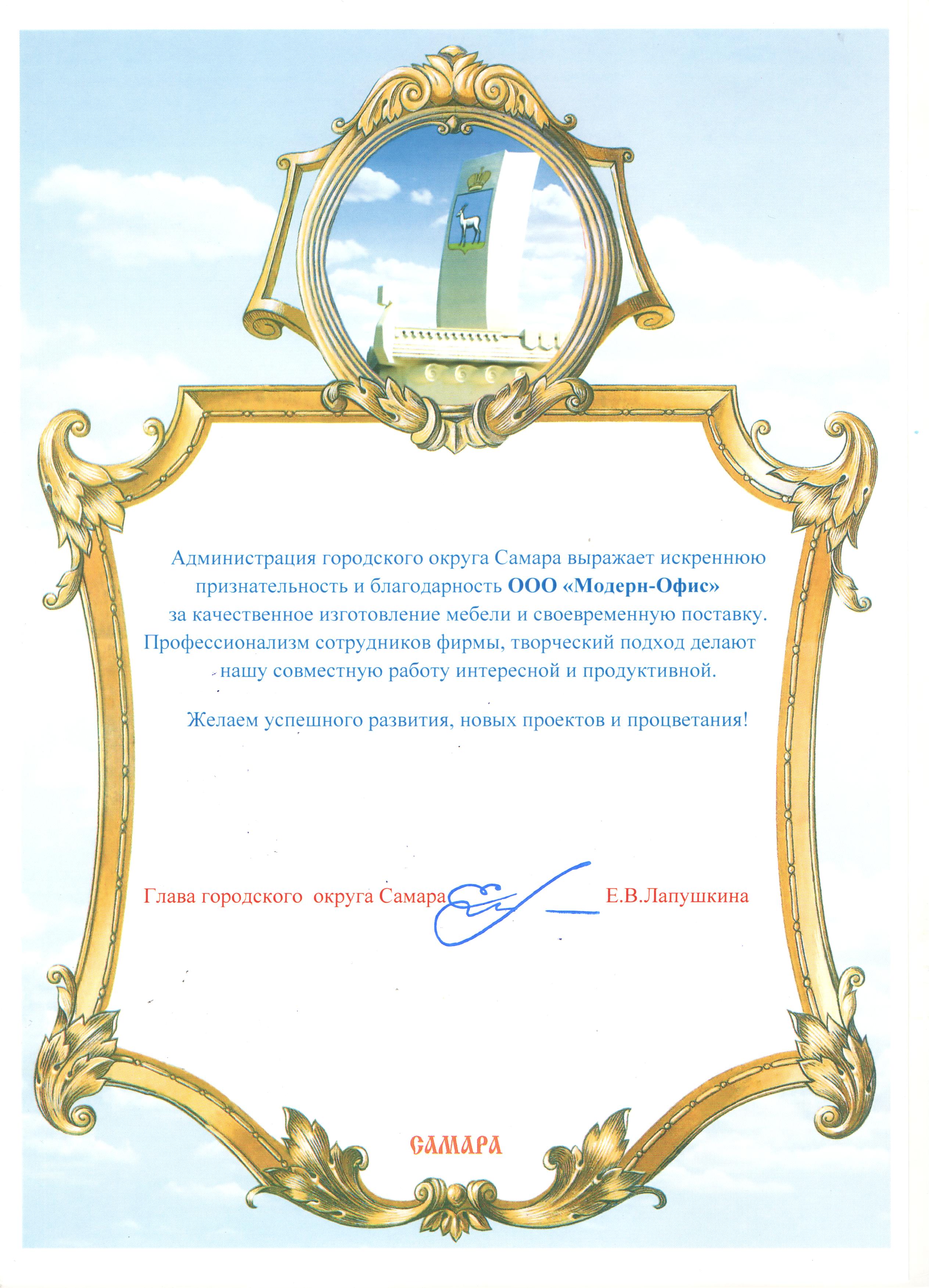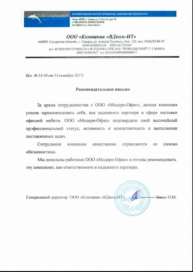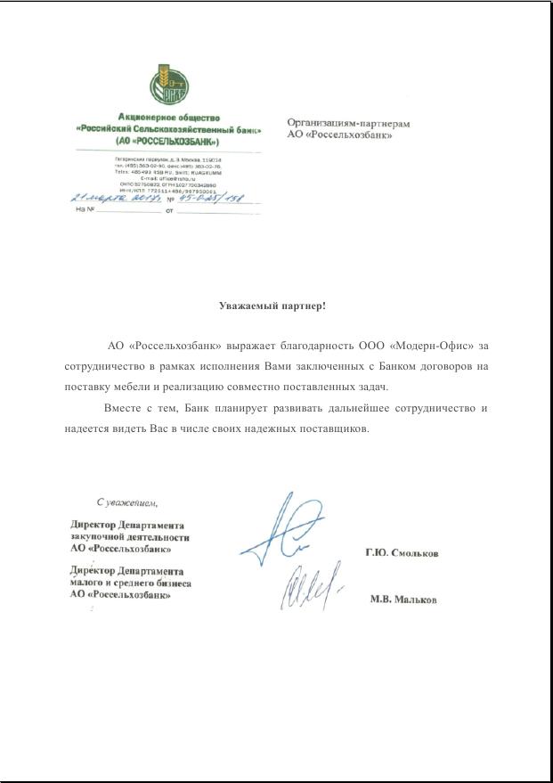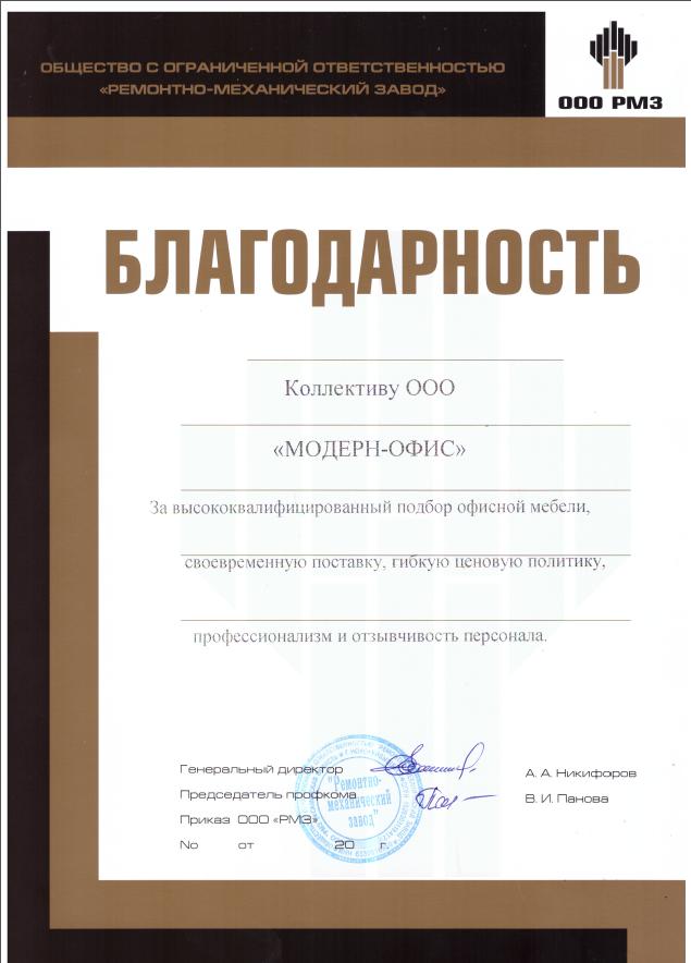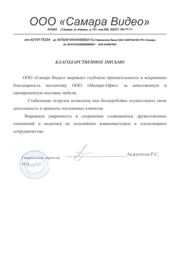 Выражаю особую признательность компании Модерн офис за прекрасно подобранный кабинет руководителя, качество исполнения и сроки поставки.